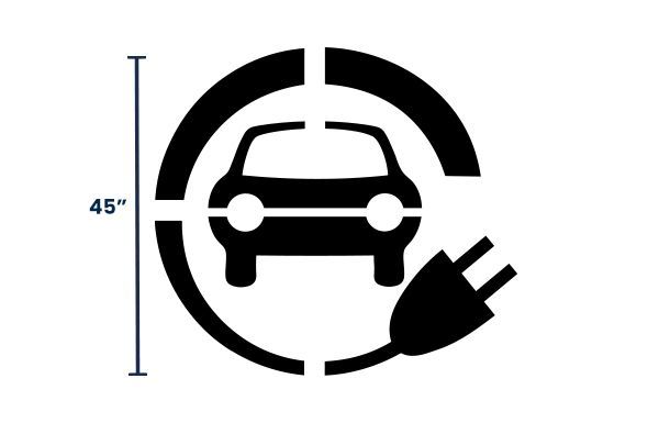 This 45-inch diameter pavement stencil clearly designates electric vehicle (EV) charging stations in parking lots, garages, and private facilities. Featuring a centered car graphic surrounded by a coiled plug symbol, the design communicates charging-only zones instantly to drivers. Durable, DOT-compliant material delivers long-lasting performance with clean paint lines on asphalt and concrete.